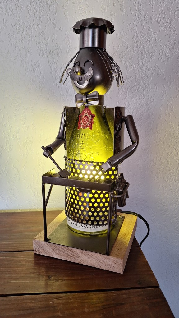 Bouteille de vin « habillée » par un bonhomme métallique œuvrant sur son BBQ.